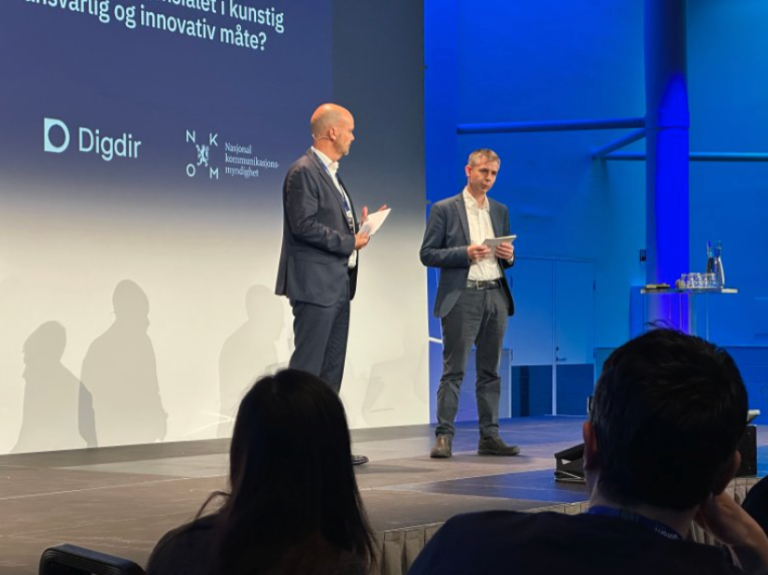 På konferansen «KI i offentlig sektor» ble Frode Danielsen fra Digdir og John Eivind Velure fra NKOM invitert for å orientere oss om KI Norge. Det var første gang de to sto på scenen sammen om temaet. Her er en oppsummering av det viktigste som ble sagt.